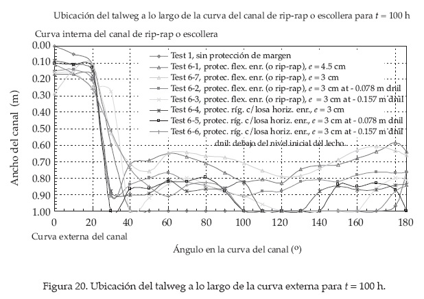 El talweg en curvas se ubica en la curva externa o cóncava. En el ensayo test 1, sin protección de margen, el talweg se ubicó a lo largo de la curva externa. En los ensayos test 6-1, test 6-2, test 6-3 y test 6-7 con protección flexible con base en escollera y a lo largo de la curva externa, se logró que el talweg fuese desviado hacia el eje del canal. La desviación del talweg es de hecho la principal influencia de una protección de margen flexible. En los ensayos test 6-4, test 6-5 y test 6-6 con protección rígida con base en escollera y a lo largo de la curva externa, se produjo una socavación de la protección, tal como se aprecia en la figura 20, entre los ángulos 120 y 180°.