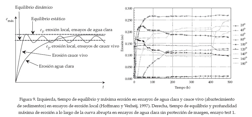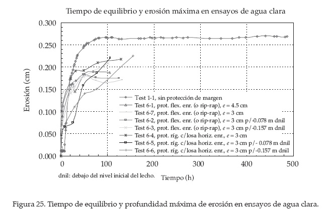 Inmediatamente tras el inicio de cada ensayo, un periodo inicial de erosión rápida es proseguido por una etapa de equilibrio que se alcanza cuando la alteración del flujo producto de las fosas de erosión reduce la magnitud de la tensión o esfuerzo de corte (en el fondo del cauce), de tal manera que la partícula de sedimento en el fondo no puede ser más movilizada o removida de la fosa. Debido a la fluctuación de la turbulencia, la profundidad de la fosa erosiva variará aun hasta después de que se alcancen las condiciones de equilibrio. La diferencia entre ensayos de cauce vivo y agua clara es en particular referida al tiempo requerido para alcanzar el equilibrio, puesto que el primer tipo de ensayo es más rápido que el segundo. También hay una diferencia en la configuración del cauce en el estado de equilibrio, donde las formas de fondo para ensayos en cauce vivo originan una oscilación de la erosión máxima alrededor de un estado de equilibrio dinámico (ver figura 9). Sin recirculación de sedimentos (ensayos de agua clara), el material del fondo del cauce es gradualmente erosionado y transportado hacia el tramo final del canal de ensayo, decreciendo en el tiempo el volumen de transporte de sedimentos. Al alcanzarse el estado de equilibrio, el transporte de las partículas ha cesado y el volumen de sedimentos permanece constante. Las condiciones de equilibrio son alcanzadas tal como se muestra en las figuras 9 y 10 del ensayo test 1, sin protección de margen.