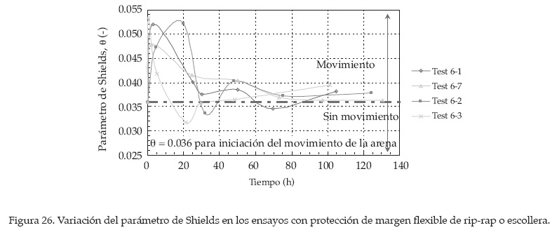 El parámetro de Shields se encuentra relacionado con el tiempo de equilibrio, el cual quedó confirmado al final de los ensayos de protección de margen flexible, alcanzándose el valor de 0.036 (ver figura 26).