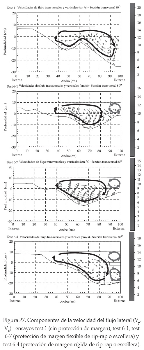 11. Se detectó un típico patrón de flujo helicoidal. Los resultados indicaron que el movimiento de la sección transversal contiene una celda principal de circulación, el clásico movimiento helicoidal (celda ubicada en la región central). Además, en los ensayos con protección flexible, se detectó una débil celda de rotación antihoraria (celda en la margen externa) en la esquina formada entre la margen externa y la superficie de agua. En los ensayos con protección de margen rígida se detectaron dos celdas de giración antihoraria sobre la margen externa: una similar al de la protección flexible y la otra debajo de la protección rígida de escollera. A esta última celda se le atribuye la socavación de la protección de margen rígida. No fue posible medir las velocidades encima y debajo de la protección rígida debido a las limitaciones del velocímetro acústico tridimensional con respecto a la profundidad del volumen bajo muestra para el registro de velocidades encima de la protección rígida y la disponibilidad de una adecuada ubicación del velocímetro acústico debajo de dicha protección. Para asegurar la existencia de las dos celdas en la margen externa descritas, se observaron los vórtices aguas abajo, lo cual proveyó la evidencia de la existencia de ambas celdas.