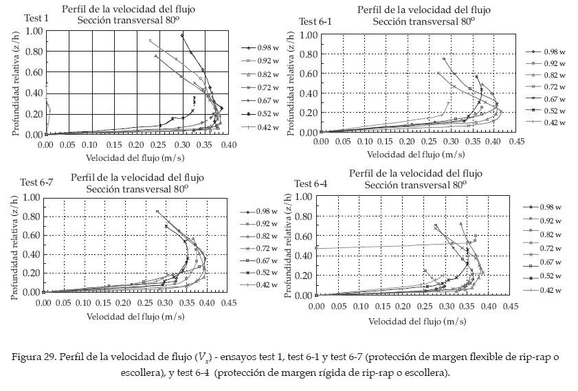 En otros estudios de flujo en curvas (De Vriend, 1971), las velocidades en dirección aguas abajo (Vx) se incrementan en dirección hacia la margen externa y el núcleo de velocidades máximas se localiza en la parte inferior de la columna de agua junto a la margen externa. Esto se confirmó en los ensayos ejecutados.