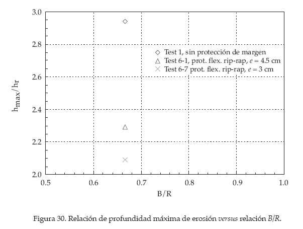 De los datos registrados en los ensayos se obtuvo las siguientes relaciones que permitieran establecer la profundidad máxima de erosión en curvas abruptas mediante la derivación de la fórmula de Fargue (1907) (ver figura 30). Las fórmulas para la predicción de la profundidad máxima de erosión y su aplicación a condiciones de campo se presentan en las conclusiones.