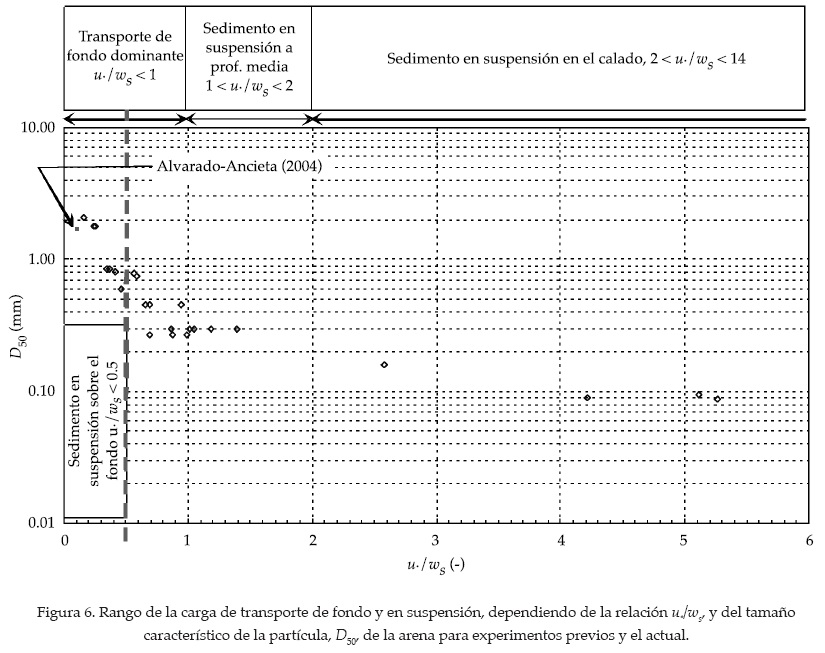 En la figura 6 se muestra la importancia del transporte de fondo y en suspensión distribuido sobre el calado, dependiendo de la relación entre la velocidad de tensión de corte (en el fondo) y la velocidad de caída de la partícula de sedimento, u*/ws, y el tamaño del diámetro característico, D50, de la arena. De acuerdo con Van Rijn (1993), para la presente investigación, la relación entre la tasa de sedimentos en suspension y total, Ss/Stotal, es de aproximadamente 0.1, lo que significa que el transporte de fondo es dominante, en comparación con experimentos previos, donde el transporte en suspensión era el dominante.