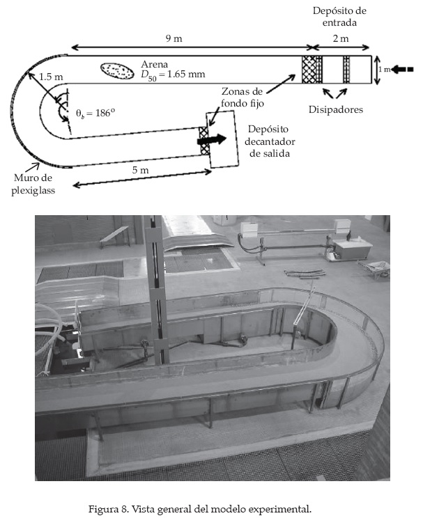 El objetivo de la investigación es estudiar, a partir de datos experimentales, las características del flujo y la erosión en una curva cerrada. Una curva de fuerte curvatura es aquella cuya relación entre el radio de curvatura, R, y la anchura, B, es menor que 3. Para que los efectos de la curvatura se materialicen, el desarrollo de la curva debe ser lo suficientemente grande. La idea de desarrollo se cuantifica con el ángulo de la curva o con el parámetro de sinuosidad. Las premisas básicas del trabajo experimental son que la relación R/B sea inferior a 3 y que el ángulo de desarrollo de la curva sea grande.