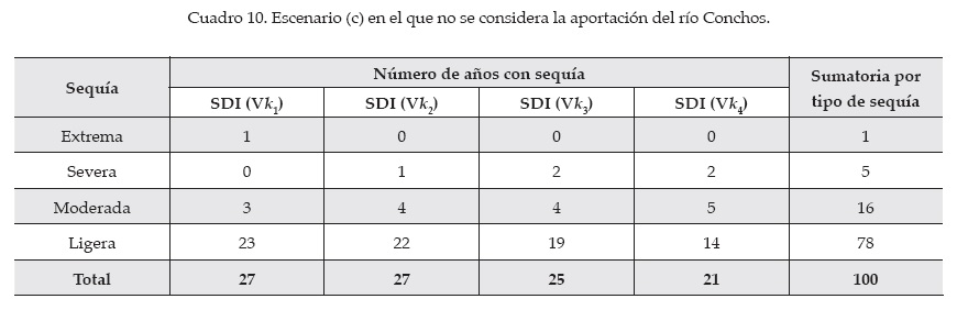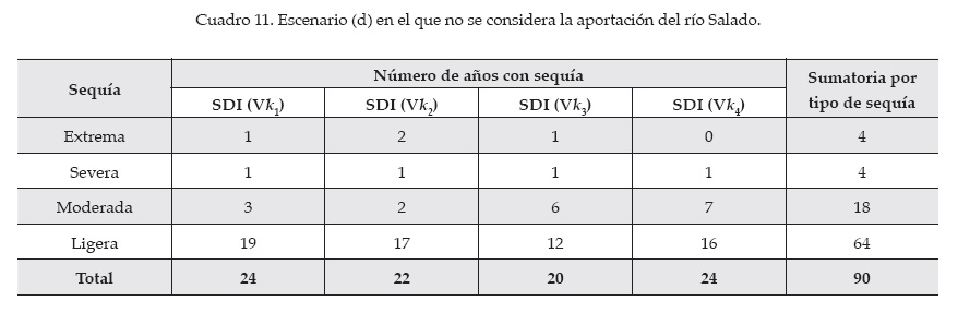 Al realizar un análisis para determinar cuál es el afluente de mayor influencia de acuerdo con el SDI, se establecieron cuatro escenarios: a) sin la existencia de la aportación de los tres afluentes agrupados, arroyo Las Vacas, y ríos San Diego y San Rodrigo; b) sin la aportación del río Escondido; c) sin la aportación del río Conchos, y d) sin la aportación del río Salado. Los resultados de estos escenarios, haciendo énfasis sólo cuando se presenta una sequía, de ligera a extrema, se presenta en los cuadros 8 a 11. (9, 10)
