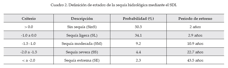 Para definir la sequía en función de los caudales de ríos, Nalbantis (2008) y Nalbantis y Tsakiris (2009) desarrollaron un índice similar al SPI, denominado Streamflow Drought Index (SDI).