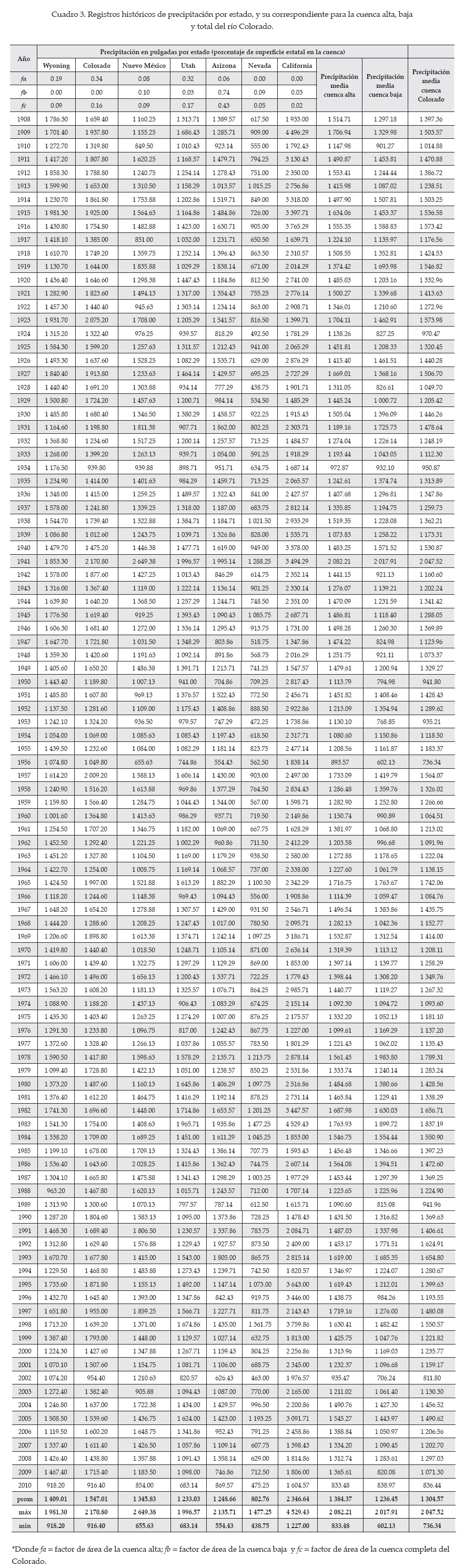 Se obtuvieron las precipitaciones por estado y su porcentaje correspondiente para las cuencas completa, alta y baja del río Colorado, estas dos últimas tomando como punto de división Lee's Ferry, como se muestra en el cuadro 3.