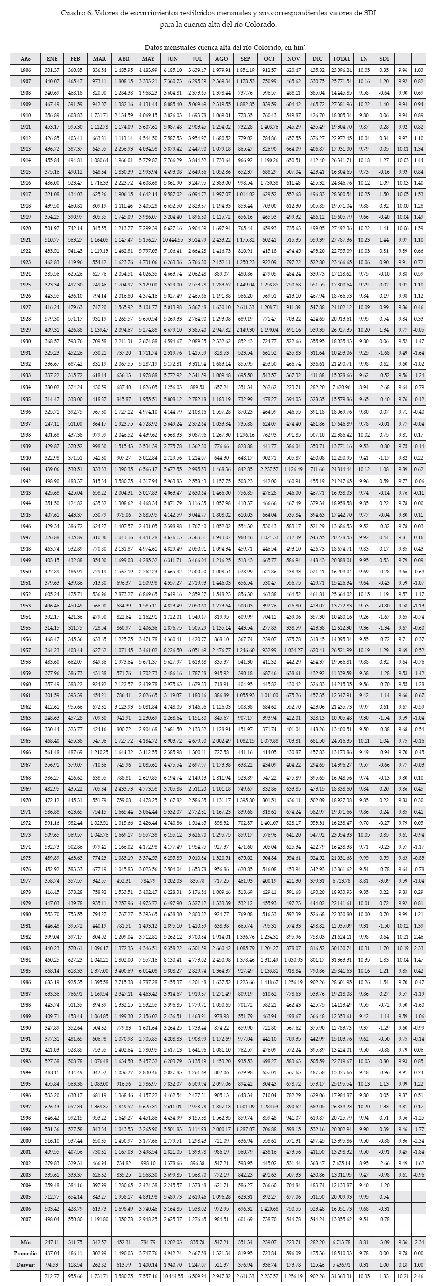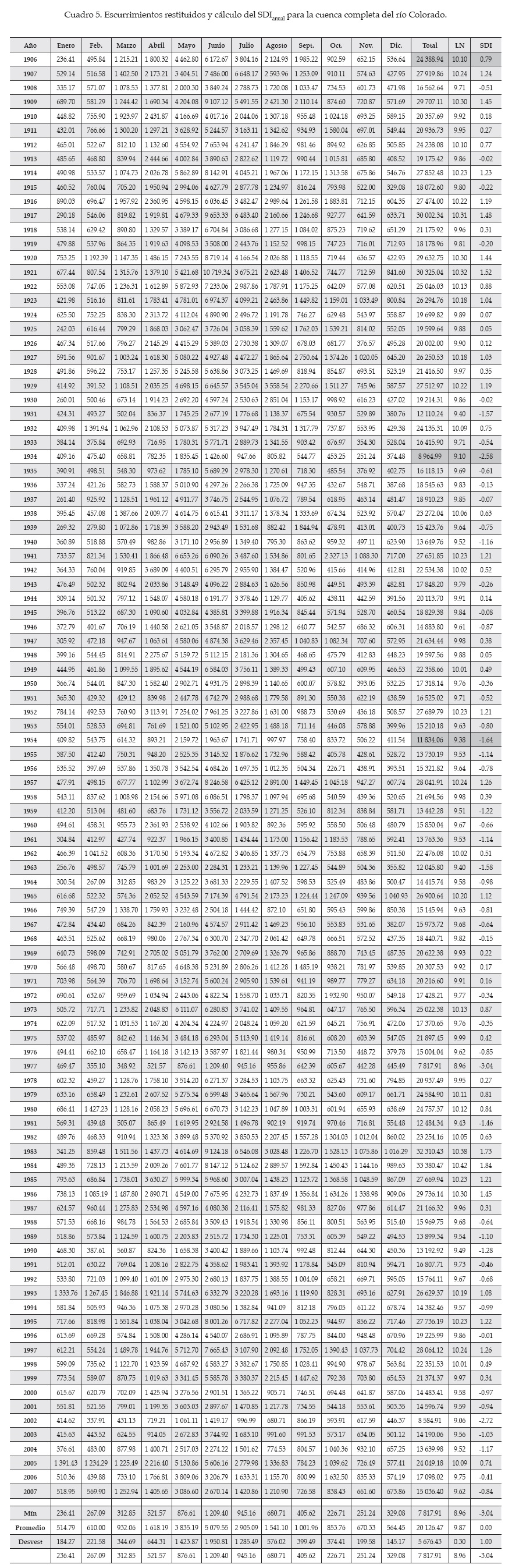 Con los escurrimientos restituidos a nivel mensual para los años comprendidos entre 1906 y 2007 (102 años, datos del USBR), se calcularon los SDI anuales para el río Colorado (ver cuadro 5).