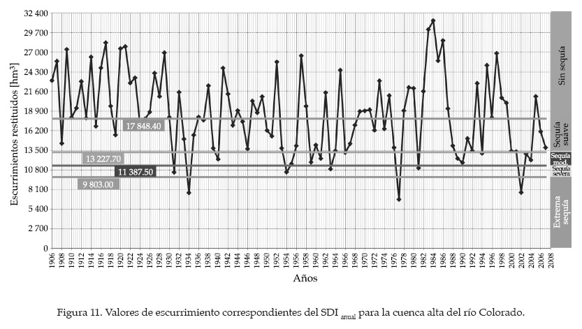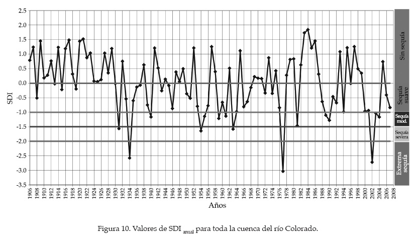 Como se observa en las figuras 9 y 10, en la cuenca completa del río Colorado, para todo el periodo de análisis, en sólo tres años se han presentado sequías extremas (1934, 1977 y 2002), ya que han estado por debajo del umbral, es decir para un SDI < -2 o menor a 10 855.35 hm3 (valor respectivo de escurrimiento para SDI = -2). El hecho de que no coincidan estos años con los de las precipitaciones puede deberse, entre otras causas, al efecto de la capacidad de regulación del sistema hidráulico y al impacto del deshielo sobre el escurrimiento.