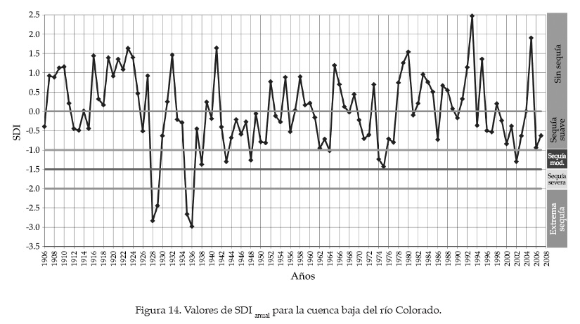 Como se observa en las figuras 13 y 14, en la cuenca baja del río Colorado, en cuatro años se han presentado sequías extremas (1928, 1929, 1935 y 1936), que han estado por debajo del umbral SDI < -2 o menor a 724.98 hm3 (valor respectivo de escurrimiento para SDI = -2). Todos ellos antes de la firma del Tratado de 1944.