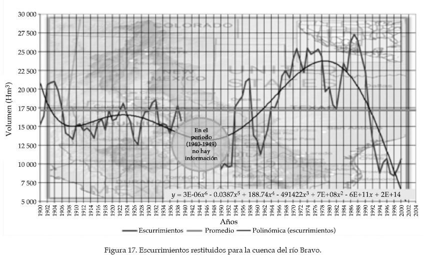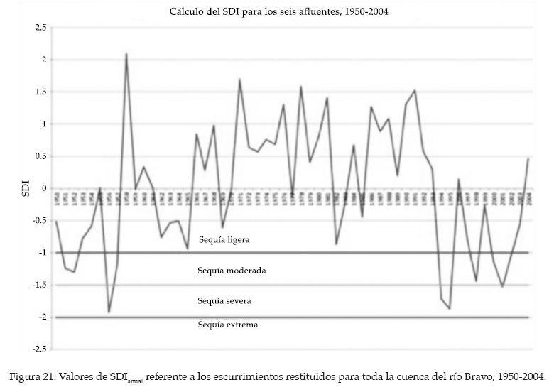 Para esta misma cuenca, en el periodo comprendido de 1950-2004, conforme al SDIanual, no se ha presentado sequía extrema en los afluentes mexicanos referidos en el Tratado de 1944, pues nunca se ha rebasado el umbral de 7 738 hm3, valor correspondiente a un SDI = -2.