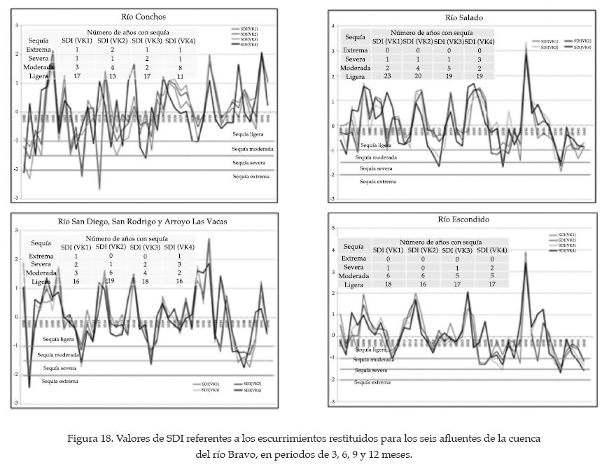 El SDI se calculó con los escurrimientos mensuales para el periodo 1900-1943 para los seis afluentes sujetos a entregas de agua de México a Estados Unidos conforme al Tratado de 1944: ríos Conchos, San Diego, San Rodrigo, Escondido, Salado, y arroyo Las Vacas. El comportamiento de la sequía se analizó a través de periodos de referencia k, cuyo inicio y final coinciden con el ciclo agrícola, es decir k1-3 meses (octubre-diciembre), k2-6 meses (octubre-marzo), k3-9 meses (octubre-junio) y k4-12 meses (octubre-septiembre), véase la figura 18.