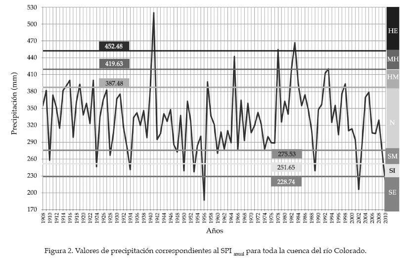 Como se observa en las figuras 2 y 3, en la cuenca completa del río Colorado, para todo el periodo de análisis, en sólo tres años se han presentado sequías extremas (1956, 2002 y 2010), ya que han estado por debajo del umbral, es decir con un SPI < -2, o menor a 228.74 mm (valor respectivo de precipitación para SPI = -2).