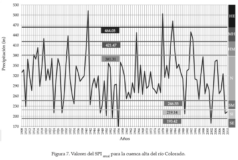 En las figuras 4 y 5 se nota que en la cuenca alta del río Colorado, al igual que en toda la cuenca, en tres años se han presentado sequías extremas (1956, 2002 y 2010) que han estado por debajo del umbral, donde el SPI < -2 o menor a 254.67 mm (valor respectivo de precipitación para SPI = -2 en la cuenca alta).