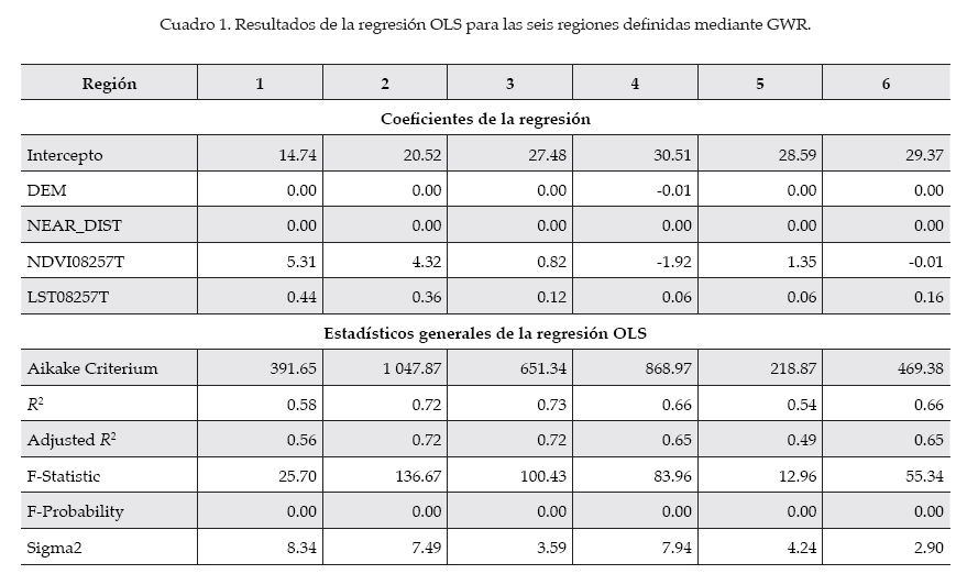 Considerando la dificultad de aplicar aproximadamente mil modelos diferentes para generar una superficie continua (mapa) de Ta, se optó por estimar un modelo de mínimos cuadrados ordinarios (OLS) para cada una de las seis regiones obtenidas (figura 4e) y aplicar estos modelos a todas las celdas de las regiones definidas, a efecto de obtener la variable de interés como superficie continua. Las variables dependientes y la independiente fueron las mismas en este análisis que para el caso de GWR. En el cuadro 1 se muestran los modelos obtenidos para cada región y sus estadísticos.