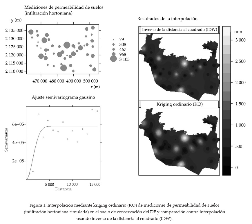 Se llevaron a cabo mediciones de permeabilidad de suelos (en términos de infiltración hortoniana simulada) en el denominado suelo de conservación del DF por INIFAP y PAOT, en el marco de un proyecto financiado por este último organismo. A fin de utilizar esta información para análisis posteriores, tales como la valoración del territorio en términos de las características que los hacen aptos para recarga del acuífero, es necesario contar con una superficie continua de este parámetro. El método de interpolación seleccionado fue KO debido a que no se encontró relación con otra variable de tipo medioambiental y a que fue posible el ajuste de un semivariograma a la variable de interés (de acuerdo con lo indicado por Hengl, 2009). La implementación se hizo en el software libre de estadística R. Los resultados se muestran en la figura 1. Los resultados son comparados contra una interpolación mecánica (IDW) utilizando una validación cruzada para cada caso; con el fin de asegurar que existe una diferencia estadística entre los dos modelos obtenidos, se corrió un test t (asumiendo distribución normal de los errores) sobre los residuales de cada uno de los métodos. Los estadísticos obtenidos de este test fueron t = 0.1396, df = 95.892, p-value = 0.8893. De acuerdo con este test, la hipótesis nula de que la diferencia entre los dos ejemplos es igual a 0 no se acepta, por lo que se define que existe una diferencia significante entre el poder de predicción de los métodos comparados.