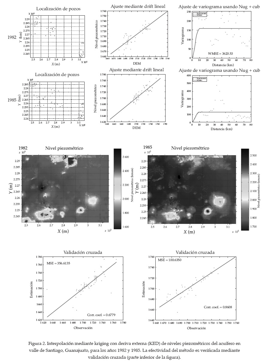 La cuenca Lerma-Chapala sufre procesos de intensa sobreexplotación de sus acuíferos, sobre todo para uso agrícola. Por ello, contar con superficies de parámetros indicativos de la condición de dichos acuíferos resulta de gran utilidad para fines de manejo y gestión del recurso hídrico. Con esta determinación se tiene el objetivo de explorar la utilización de KED en la generación de mapas de niveles piezométricos de acuíferos, ejemplificando con mediciones de niveles estáticos de la zona de valle de Santiago, Guanajuato. Se generó un script en Matlab para utilizar KED e interpolar niveles estáticos en 1982 y 1985. La deriva fue ajustada a un modelo lineal entre elevación y nivel piezométrico (correlación lineal medida mediante coeficiente de correlación de Pearson). Los datos de elevación provienen de la misión Shuttle Radar Topography Mission (SRTM, 2003) de la NASA. Los resultados del método son valorados en función del cálculo de errores cuadráticos medios y mediante un ejercicio de validación cruzada, el cual consistió en interpolar cada valor de precipitación usando el resto de las mediciones. Los resultados de este procedimiento se muestran en la figura 2. Con un porcentaje de puntos bien estimados (indicados por los coeficientes de correlación) de 70% para 1982 y 86% para 1985, se considera que KED es un método adecuado para la estimación de superficies de niveles piezométricos. El error estándar medio de la estimación es menor a 15% de los valores manejados de elevación del nivel piezométrico.