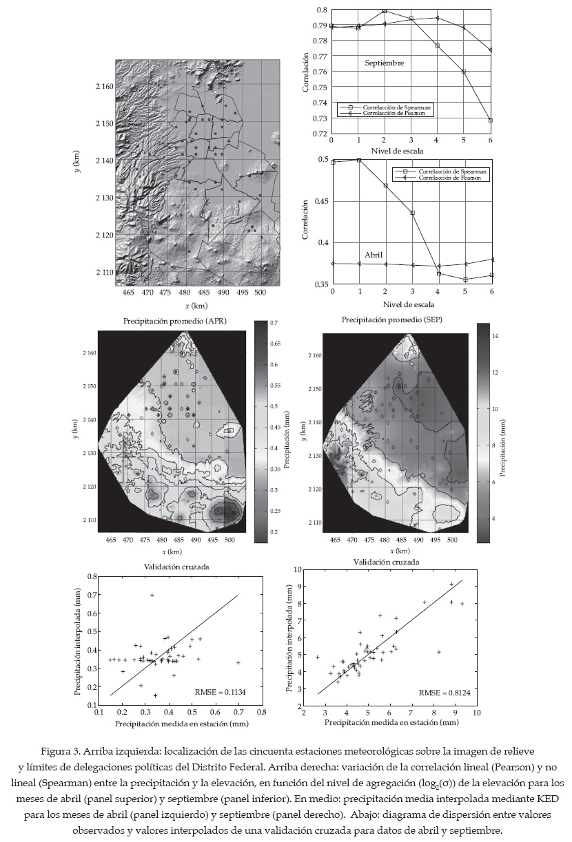 En este estudio se usó la elevación como variable externa para modelar la deriva y se aplicó KED para interpolar las mediciones de precipitación en cincuenta estaciones meteorológicas (figura 3, arriba a la izquierda). Dicha interpolación se hizo en dos meses, que representan los extremos de un mes seco (abril) y uno lluvioso (septiembre). En este caso se evaluó la correlación lineal (coeficiente de correlación de Pearson) y la correlación no lineal (coeficiente de correlación de Spearman) entre la precipitación medida y la elevación promedio en una vecindad alrededor de la localización de las estaciones. El objetivo, en este caso, fue identificar si el nivel de agregación espacial de la variable externa tiene alguna influencia en las estimaciones. Para la agregación de los datos de elevación se consideraron pesos gaussianos con desviación estándar (DE) incrementada en potencias de 2, i.e., σ = 1, 2, 4, 8, 16, 32 y 64. El modelo digital de elevaciones empleado fue proporcionado por el INEGI y presenta una resolución espacial de cincuenta metros.