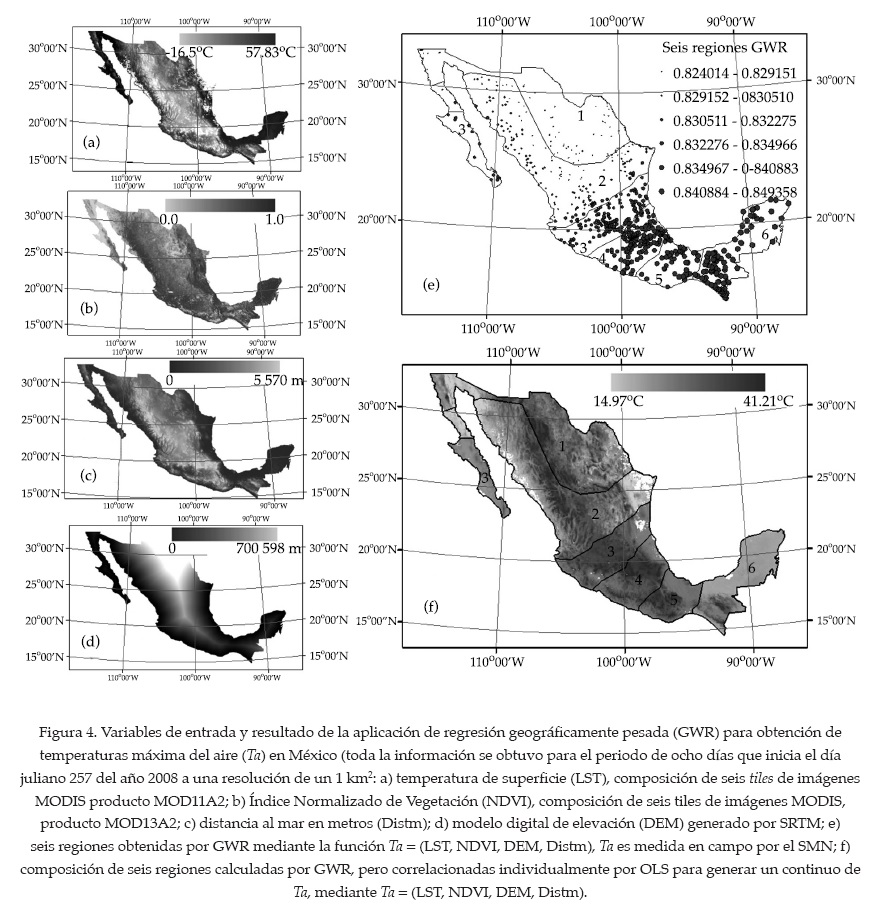El método GWR se empleó para interpolar la temperatura máxima del aire (Ta, para un periodo de ocho días que inicia el día juliano 257 de 2008) medida en 796 estaciones meteorológicas del país, usando como deriva un modelo lineal de cuatro variables independientes: elevación (SRTM, 1 km), temperatura superficial (medida por el sensor MODIS), distancia a la costa más cercana, y NDVI (calculado a partir de datos de MODIS). Una ventaja primordial de GWR consiste en que posibilita la consideración en los análisis de regresión de la influencia de algunas variables que se ven afectadas por su ubicación geográfica, permitiendo definir al modelo de regresión espacial como no estacionario. Esto asegura que se obtengan residuales no correlacionados y que se respete el supuesto básico del análisis de regresión, relacionado con la independencia de los errores de la estimación. Una importante desventaja del uso del modelo GWR es la gran cantidad de modelos generados en cada análisis, ya que genera uno por dato correlacionado. Este modelo es adecuado para cuando se tiene que trabajar con datos espaciales a escala fina, pero cuando se requieren continuos de la variable de interés en el ámbito regional resulta difícil su aplicación. Lo anterior se debe a que hay muchos modelos que aplicar y debe buscarse un criterio adecuado para regionalizar sus áreas de influencia.