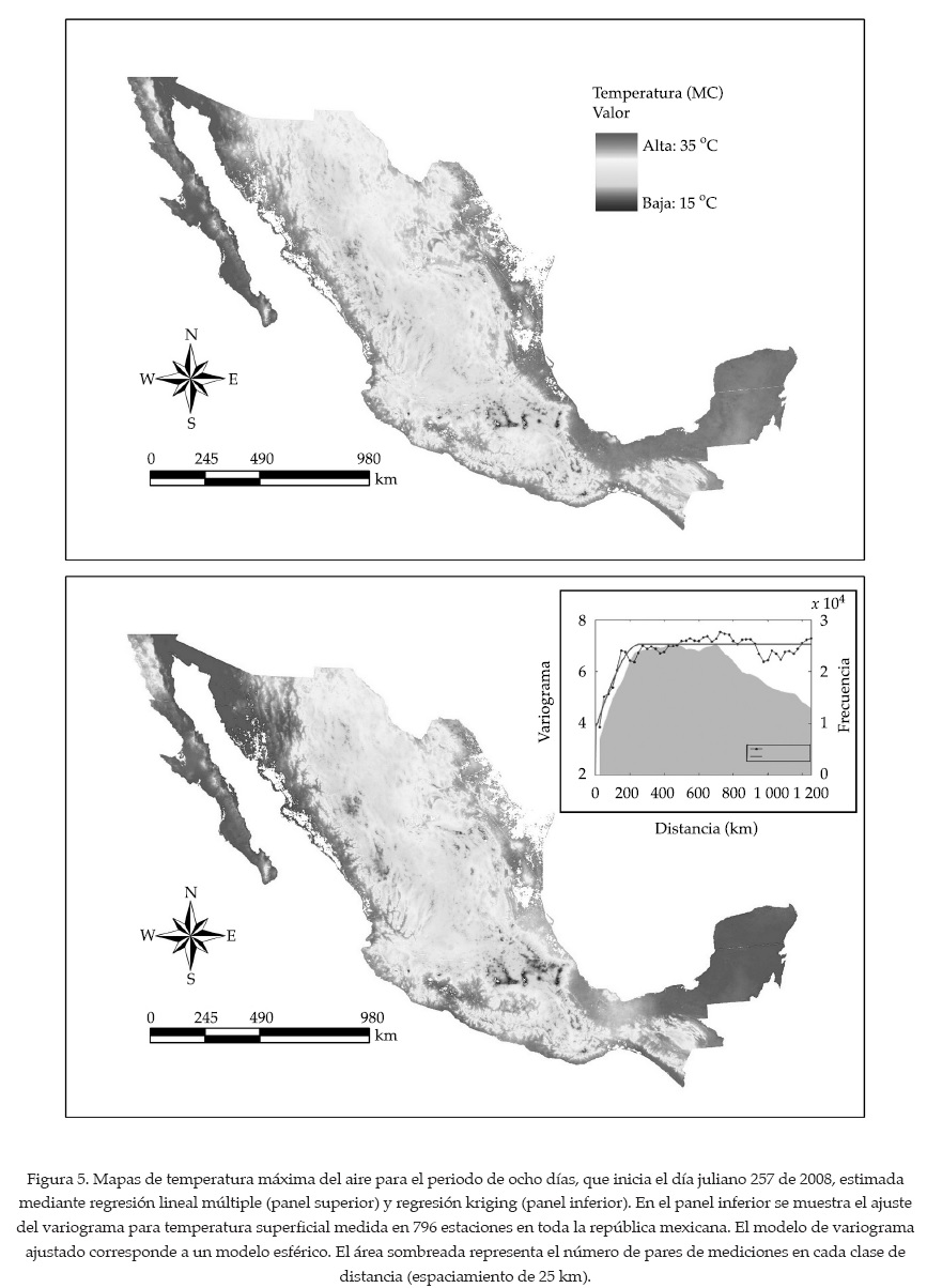 Temperatura máxima del aire (Ta) para el periodo de ocho días que inicia el día juliano 257 de 2008, medida en 796 estaciones meteorológicas del país, fue interpolada mediante RK. Un modelo lineal de cuatro variables independientes: elevación (SRTM, 1 km), temperatura superficial (LST medida por el sensor MODIS), distancia a la costa más cercana y NDVI (calculado a partir de datos de MODIS) se utilizó como deriva. Dichas variables presentaron una R2 con respecto a la temperatura superficial de 0.676, 0.274, 0.260 y 0.023, respectivamente. La aplicación del método RK consistió de dos pasos. En el primer paso se realizó una regresión lineal múltiple (R2 = 0.7, R = 0.84), donde el ajuste del modelo lineal se basó en el método de mínimos cuadrado (MC). En este caso, la varianza del error óptimo fue de 7.34. La fórmula de regresión múltiple ajustada se aplicó a todos los sitios no medidos por las estaciones, donde se conoce la elevación, temperatura superficial, distancia y NDVI (figura 5, arriba). El segundo paso consistió en modelar los residuos de la regresión como un proceso estocástico, con el fin de interpolarlos en los sitios no medidos. Para ello, primero se estimó el variograma y se determinó que el modelo esférico dio el mejor ajuste (figura 5, esquina superior derecha del panel inferior). El modelo de variograma esférico está determinado por la ecuación: