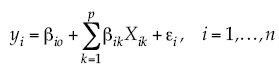 donde yi representa la variable dependiente en la posición i; βi0 representa el parámetro del intersecto en la posición i; p representa el número de variables independientes (predictivas o explicativas); βik representa el coeficiente de regresión local para la k-ésima variable independiente en la posición i; Xik es el valor de la k-ésima variable independiente en la posición i, y εi representa un término de error (también conocido como perturbación aleatoria) en la posición i.