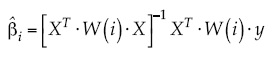 donde W(i) = diag [w1(i),..., wn(i)] es la diagonal de pesos de la matriz que varía en función de cualquier calibración o predicción localizada en i; X es la matriz de variables exógenas con una primera columna para los primeros interceptos; y es el vector de variables dependientes y