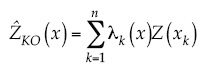 Si la media es constante en el dominio W, entonces puede eliminarse de la ecuación anterior, forzando que los pesos kriging λk sumen la unidad. En tal caso, el estimador se denomina KO y se expresa como:
