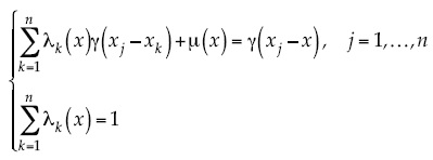 donde μ denota el multiplicador de Lagrange. Alternativamente, si se considera la relación entre la función de covarianza y la función de semivariograma γ(h), i.e., C(h) = C(0) - γ(h), el mismo sistema se puede escribir como: