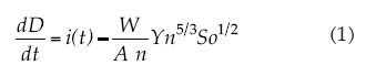 Donde W es el ancho característico de la subcuenca; n, el coeficiente de rugosidad de Manning; Yn, la profundidad normal y se calcula Yn = (D Dp); D, la lámina de agua; Dp, el almacenamiento de retención superficial; So, la pendiente media de la subcuenca; t, el tiempo; A, la superficie de la subcuenca vista en planta, y finalmente i es la intensidad de lluvia neta (una vez restada la evaporación y la infiltración). La ecuación mostrada se resuelve mediante un esquema en diferencias finitas de Newton-Raphson en cada incremento de tiempo (Tisdale et al., 1999; Tsai, 2003).
