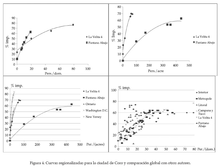 La hidrología urbana moderna establece dos criterios para la determinación indirecta del valor del porcentaje de suelo impermeable de una subcuenca urbana: el primero de ellos correlaciona el porcentaje de área impermeable con la densidad poblacional concentrada en esa subcuenca y el otro lo relaciona con la cantidad de domicilios por unidad de área. La fiabilidad de ambos criterios es un tema que está actualmente en discusión; sin embargo, los dos enfoques parten de la base de que existe dependencia directa entre la impermeabilidad del suelo y los procesos urbanizadores (Pinto y Martins, 2008). A criterio de los autores, la estimación indirecta del parámetro de impermeabilidad depende principalmente de la disponibilidad de datos demográficos (núm. hab./área) adecuado a la escala del estudio hidrológico urbano. Para efectos del posterior análisis comparativo a nivel local y global, se construyeron curvas que correlacionan este parámetro con las dos variables mencionadas (Heaney et al., 1999). Los instrumentos para levantar información de campo (encuestas) demostraron que para las zonas analizadas, el promedio de habitantes por vivienda es de 4 hab./dom.