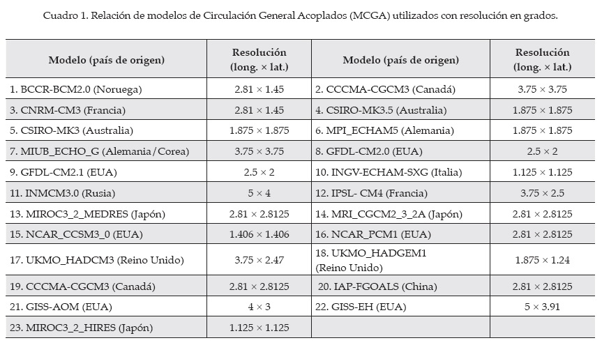 En el cuadro 1 se presentan la resolución y el país de origen de los 23 modelos de circulación general acoplados (MCGAs), usados para la generación del ensamble de escenarios de cambio climático y que fueron considerados por el IPCC en su última comunicación (IPCC, 2007). Los MCGA incluyen componentes dinámicos que describen procesos atmosféricos, oceánicos y de superficie terrestre, así como los hielos marinos y otros componentes. Aunque las dinámicas a gran escala de estos modelos son integrales, se sigue parametrizando para representar procesos físicos aún no resueltos, como la formación de nubes y precipitación, el océano y la formación de masas de agua, etcétera. La incertidumbre en el proceso de parametrización es la razón primaria por la cual las proyecciones climáticas difieren entre distintos MCGAs (Solomon et al., 2007).