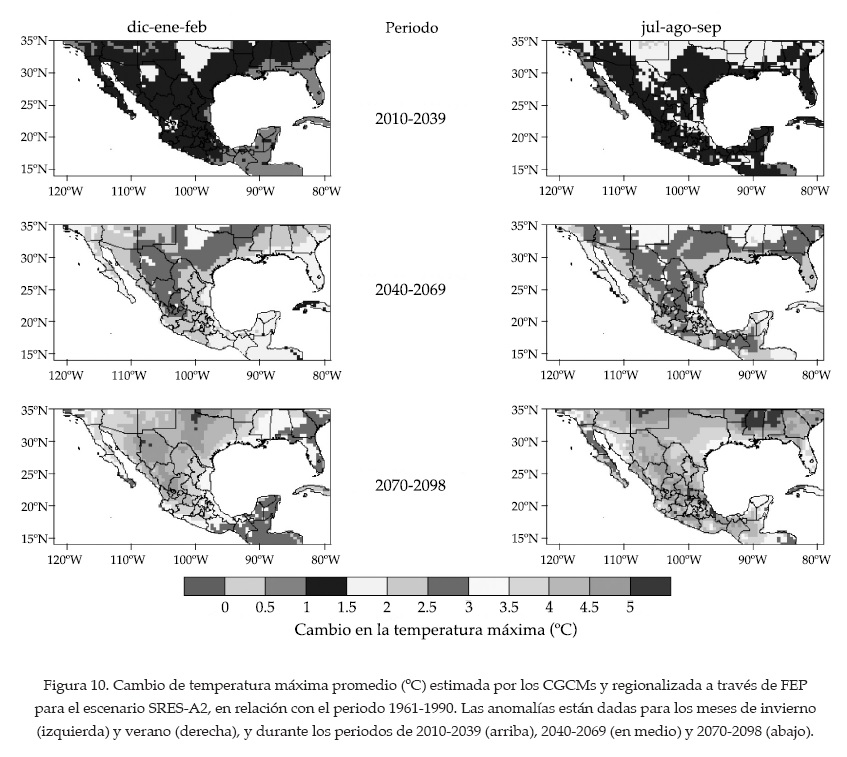 El análisis de las anomalías proyectadas para la segunda mitad del presente siglo en México presenta un incremento en temperatura y menor precipitación en casi todo el país. Se observa que el cambio de la temperatura media es mayor para el verano que para el invierno, acentuándose para finales de siglo, donde se observan valores por arriba de los 5 °C para algunas regiones en el norte y centro sur del país. Las mayores reducciones de precipitación se presentarán durante el invierno en la zona occidental del país, sin embargo presentan poca variación para el verano en esta zona. Es notable que los únicos valores positivos (incremento de precipitación) se detectaran para una pequeña región localizada entre Coahuila y Durango.