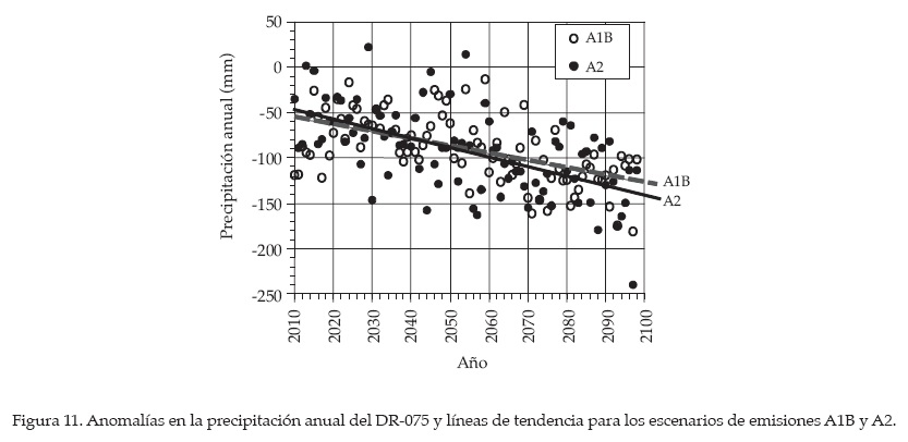 Para el caso de aplicación agrícola, presentado en las figuras 5, 6 y 7, se observa una tendencia significativa a disminuir la precipitación en ambos escenarios (figura 11). El escenario A2 presenta una mayor disminución (-1.1 mm/año) en la precipitación para fines de siglo que el escenario A1B (-0.81 mm/año), así como mayor variabilidad de la precipitación durante el presente siglo. Una disminución en la precipitación de una zona de riego indica un incremento en los requerimientos de riego de los cultivos, por lo que se deberán implantar acciones de adaptación por posibles impactos del cambio climático, al disminuir la precipitación e incrementarse la temperatura.