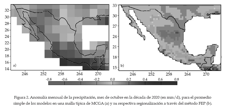 En la figura 2 se resume la implementación del método FEP al pasar de una malla típica de MCGA de 2.5 × 2.5° (A) a una malla más fina de 0.5 × 0.5° (B), con una resolución más adecuada para estudios de impacto regional. Se muestra que el promedio aritmético de los 23 modelos (figura 2A) puede ser diferente que el promedio ponderado calculado por el método FEM, inclusive puede cambiar de signo, como se presenta para diferentes zonas de México (el centro y sur de la península de Baja California; el noroeste y centro norte de México, y en la península de Yucatán). Lo anterior se explica por el hecho de que el FEP no necesariamente sigue la tendencia del promedio aritmético del ensamble de modelos, sino que pondera los mejores modelos de acuerdo con los dos criterios de fiabilidad, representados por los factores RB,i y RD,i. Sin embargo, en la mayoría de los casos se observa una correspondencia adecuada entre los resultados de gran escala y los de escala regionalizada obtenida con el método FEP. En particular, Montero y Pérez (2008), en su figura 1.3, presentaron resultados del mes de julio para la década de los años 2080, para el promedio de los factores de fiabilidad RB,i y RD,i, y el combinado de éstos, Ri, donde se puede apreciar que las zonas de mayor confianza para la precipitación en México durante este periodo resultan ser la península de Baja California y la región noreste del país.