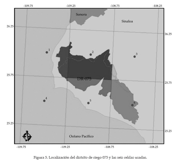 El estudio de aplicación fue el Distrito de Riego 075 (DR-075), con una superficie regable de 211 mil ha, el distrito con mayor superficie en México. Se localiza en el Valle del Fuerte, estado de Sinaloa, México, 25.4-26.1° N y 108.4-109.4° O, y con una altitud promedio de 20 m. Existen seis celdas numeradas del uno al seis, con valores de proyecciones de cambio climático en la base de datos del sistema en el área de influencia del DR-075, como se muestra en la figura 5.