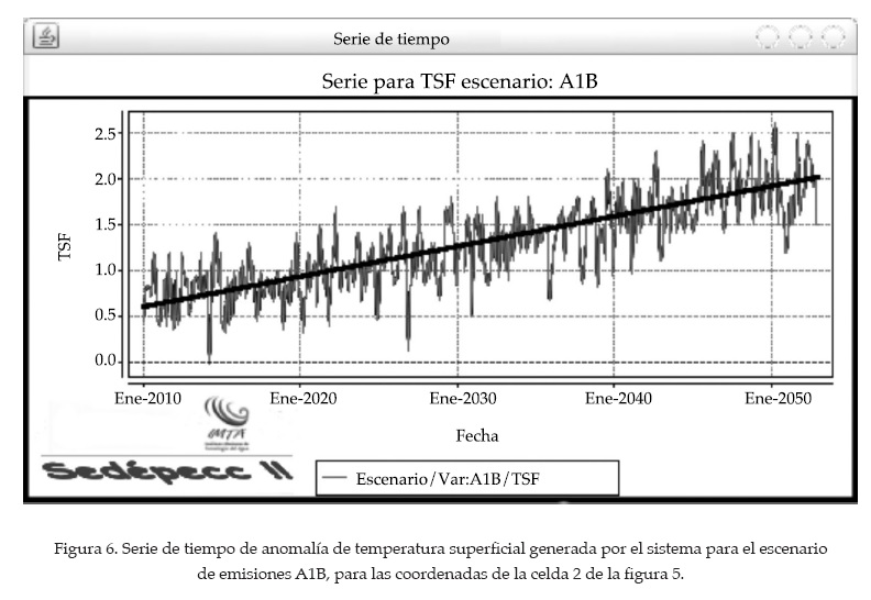 donde Pi es el peso de la celda i, con anomalía Δxi, estimado como la fracción de área de la zona de riego que se encuentra en el área de influencia de cada celda i con respecto al área total. Para el caso de aplicación mostrado en la figura 5, los pesos corresponden a las fracciones de superficie del DR-075 de las celdas 1, 2, 3, 4, 5, y 6, que fueron estimadas en 0.112, 0.40, 0.024, 0.002, 0.162 y 0.30. El sistema desarrollado facilita la consulta de proyecciones climáticas para una malla regular de 0.5 x 0.5° a través de su interfaz de despliegue gráfico (figura 6).