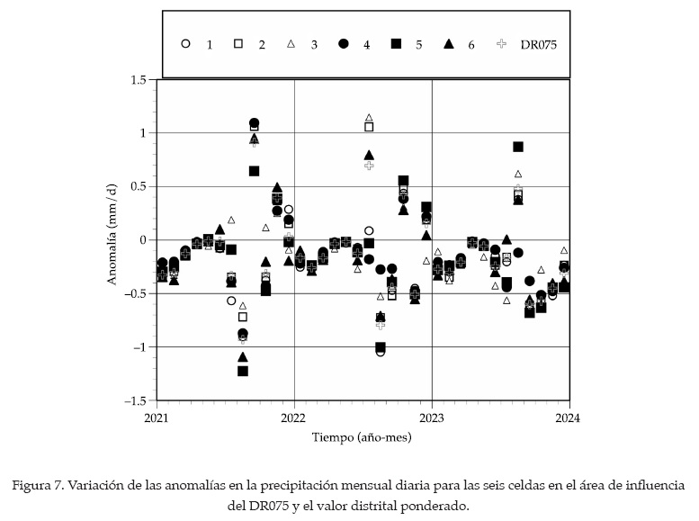 Como ejemplo de extracción de proyecciones climáticas usando el sistema desarrollado, se presenta en la figura 7 la variación mensual diaria de las anomalías en la precipitación de las seis celdas xi de la figura 5, para un periodo de tres años, que corresponde a 36 valores mensuales. Los valores de la variable climática de interés X para la zona de riego pueden estimarse usando la ecuación (4), considerando los valores de la variable xi y el peso Pi para cada celda en el área de influencia del distrito de riego DR-075. Las anomalías mensuales de la precipitación pueden ser obtenidas al multiplicar el número de días del mes por la anomalía diaria y la anomalía anual, al acumular las anomalías mensuales del año. Para cada mes se tienen en la figura 7 seis valores de las anomalías que corresponden a las celdas en el área de influencia del distrito de riego 075 (figura 5) y un valor global de la variable ponderada con el símbolo "+".