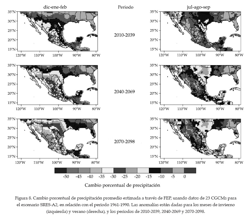 Los resultados obtenidos con la aplicación del método FEP para el escenario SRES-A2 (figura 8) muestran una disminución generalizada de la precipitación en México, tal como fue reportado por Magaña y Caetano (2007), y por Seager et al. (2010), para el suroeste de Estados Unidos, con cambios porcentuales más pronunciados en invierno que en verano. Existe una microrregión localizada al suroeste de Coahuila donde se observan cambios positivos de precipitación para el verano.