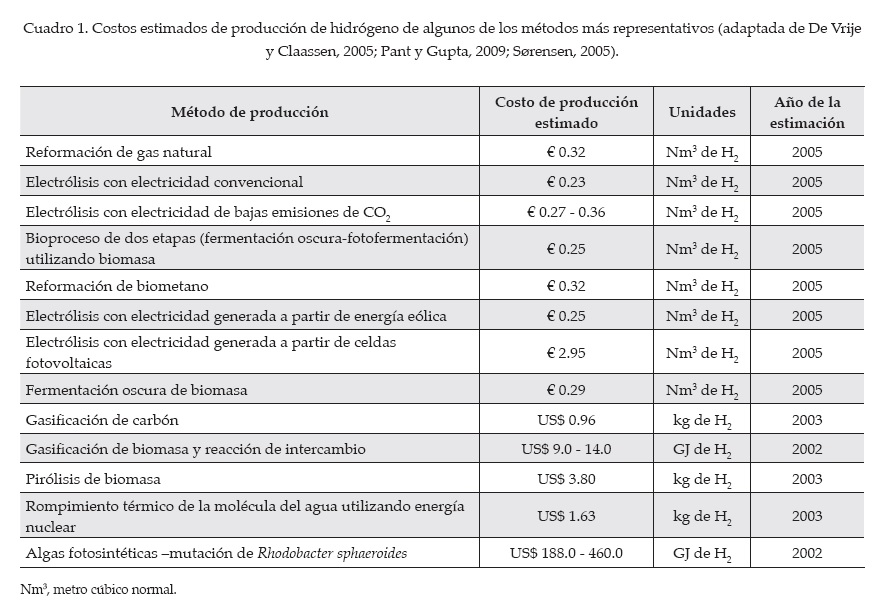 En la UNAM se encuentra un vehículo ecológico multifuncional (Ecovía), un automóvil híbrido, operado con electricidad e hidrógeno por medio de una celda de combustible. La celda de combustible tipo PEM (Proton Exchange Membrane, por sus siglas en inglés), con un consumo de hidrógeno (H2) teórico de 10.6587 gH2/min, con una pureza mayor o igual a 99.999%, comprimido a 41.37 MPa en un par de tanques de alta presión, con una capacidad máxima de 0.5 kg de H2 cada uno. En Ciudad Universitaria (CU) se tiene una flotilla de 150 vehículos para la vigilancia de un área de más de 7 millones de m2. Se espera que en un futuro, el Ecovía sustituya estas unidades que consumen gasolina, emitiendo aproximadamente 2.32 kgCO2/L de combustible (Timilsina y Shrestha, 2009). El gasto económico del Ecovía es de 10.4 millones de pesos para operar ocho horas continuas por día durante un año. Por tal razón, es de suma importancia llevar a cabo un análisis de factibilidad para suministrar el hidrógeno necesario. En el cuadro 1 se aprecian los costos estimados de producción de hidrógeno de las principales metodologías disponibles a la fecha.