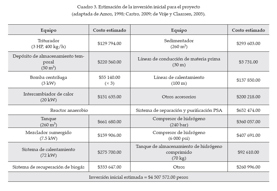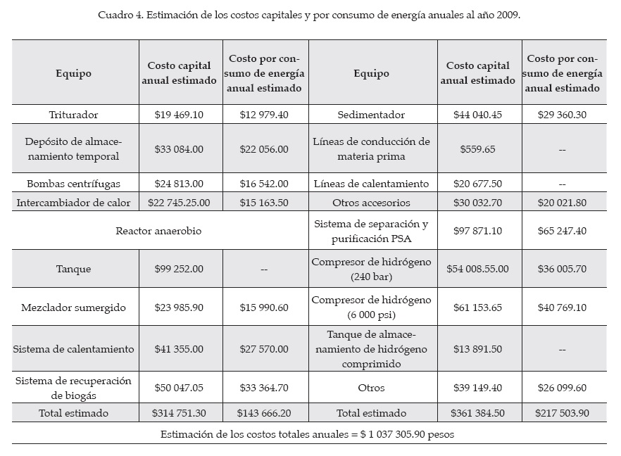 En el cuadro 3 se muestra un estimado de la inversión inicial. Para el costo capital anual de los equipos se asume que representa el 15% de su valor de adquisición, mientras que el gasto anual por concepto de energía equivale al 10% del mismo (de Vrije y Claassen, 2005). En el cuadro 4 se observan las estimaciones de los costos capitales y por consumo de energía por año de la planta de producción de hidrógeno, asumiendo como nulo el costo de adquisición de la materia prima y sin considerar los costos derivados del transporte de la materia prima y del pago al personal adscrito a la planta. Dado que se espera que la producción anual de hidrógeno al 99.999% de pureza alcance los 2 167.2788 kg y que los costos anuales totales de la planta asciendan a $1 037 305.9, el costo estimado de producción por kilogramo de hidrógeno resulta ser igual a $478.62/kgH2.