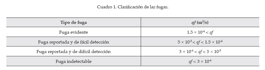 Para la elección del tamaño del fallo se hace un análisis de la clasificación del caudal fugado y de la forma de detección de las fugas (cuadro 1, adaptado de McKenzie, 1999). De esta clasificación se considera el rango de caudal equivalente a las fugas reportadas y de fácil detección. Este tipo de fugas genera un medio saturado en mayores proporciones alrededor del fallo, con mayor capacidad de saturación alrededor del fallo, generando un ambiente propicio de mezcla y trasporte de contaminantes.