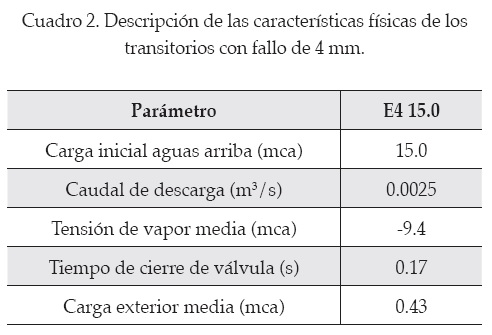 La frontera interna del modelo numérico está entonces representada por el modelo de cavitación y el modelo del fallo. Para aplicar el modelo numérico se obtienen las variables de la simulación experimental, entre las cuales se tiene el tiempo de cierre de válvula y la carga exterior media, que se obtienen a partir del video de alta definición. La tensión de vapor se obtiene del valor medio medido con el transductor (cuadro 2).