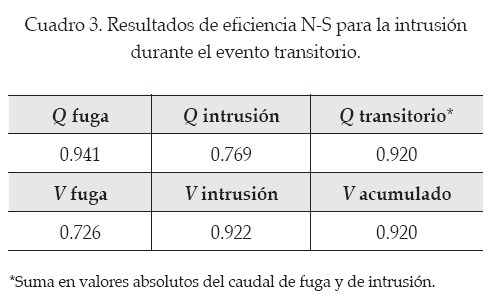 La eficiencia (E) presenta valores en un rango de -∞ y 1; básicamente, cuanto más cerca el modelo de eficiencia es a 1, más exacto es el modelo. Cuando la eficiencia es menor a cero (-∞ < E < 0), la media experimental es una mejor predicción que el modelo numérico. Aplicando este criterio a caudales y volúmenes de intrusión, se obtienen los resultados descritos en el cuadro 3.
