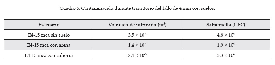 Con la presente metodología se ha determinado una forma de cuantificar los volúmenes de intrusión que pueden generarse en diversas condiciones en el entorno del fallo. Se han obtenido los volúmenes de intrusión acumulados al final del evento transitorio, si se considerase una carga contaminante en el exterior, se puede entonces cuantificar el grado de contaminación debida al evento transitorio ligado a los fallos en conducciones y tomando en cuenta el medio exterior poroso. Fuentes de contaminación, como son los encharcamientos en zonas verdes en el entorno urbano y en zonas de riego aledañas a la ciudad, pueden presentar concentraciones de bacterias en torno a 1.4 × 105 UFC/100 ml de salmonella (Kirmeyer et al., 2001; Mora, 2011). En este caso, para los volúmenes resultantes, la contaminación en la conducción de agua se muestra en el cuadro 6.
