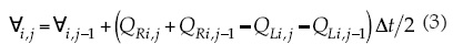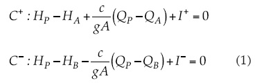 donde H representa la carga de la siguiente forma: en el instante i para P, en un instante y espacio anterior de i para B, y en un instante anterior y un espacio posterior de i para A; Q representa el caudal en el instante i para P, en un instante anterior y espacio posterior a i para A, y en un instante y un espacio anterior a i para B; I representa las pérdidas por fricción; c, la celeridad; g, la aceleración de la gravedad; A, el área de la sección transversal de la conducción.