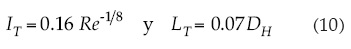 La turbulencia en las fronteras de entrada y salida se especifican con la intensidad y la longitud de escala de la propia turbulencia. En flujos totalmente desarrollados, la intensidad toma valores de entre 1 y 10%, representando flujos poco o muy turbulentos, respectivamente. La intensidad y la longitud de la turbulencia (10) pueden obtenerse a partir del número de Reynolds y de la longitud característica de la sección transversal del flujo, respectivamente. (Fluent, 2005; Multiphysics, 2008):