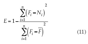 Una forma de evaluar la convergencia es con el criterio de eficiencia (E) propuesto por Nash-Sutcliffe en 1970 (Krause et al., 2005)se define como la unidad menos la suma de la diferencia entre los valores físicos (F) y numéricos (N) al cuadrado, normalizados por la varianza de los valores físicos durante el periodo de investigación (11):