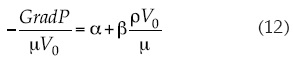 donde GradP es el gradiente de presión a través del espesor poroso; μ, la viscosidad cinemática; ρ, la densidad del fluido; V0, la velocidad del flujo en la dirección perpendicular a la sección del medio exterior; α y β, parámetros en función del medio poroso y se obtienen de forma empírica. Se utiliza la ecuación modificada de Ergun, en la que se considera la fracción de vacío del medio y la longitud característica del medio basada en el diámetro de la esfera media. Los parámetros a determinar, considerando la ecuación modificada de Ergun, son los que se presentan en las siguientes relaciones (13):