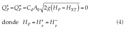 Por otro lado, el modelo del fallo que genera la intrusión y la fuga puede ser descrito con el análisis del flujo a través de orificios, incluyendo situaciones de presión negativa (Covas et al., 2005; López et al., 2008). En el caso de la modelación numérica, el análisis se realiza con el fallo circular de 4 mm. De acuerdo con Bergant et al. (2003), el fallo se puede implementar en el MOC como una condición de frontera interna. La fuga es simulada mediante la ecuación que relaciona a la carga y el flujo de aguas arriba con la carga y el flujo hacia aguas abajo (4):