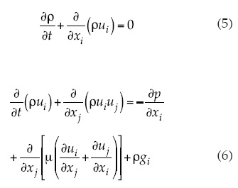 El modelo matemático de CFD está basado en la solución de las ecuaciones de la mecánica de fluidos (5) y (6), considerando fenómenos turbulentos. Los flujos turbulentos requieren de un tratamiento específico en las ecuaciones de la mecánica de fluidos; la predicción de las características del flujo se realiza mediante diversas aproximaciones. En el presente trabajo se utiliza uno de los modelos basados en las ecuaciones promediadas de Navier-Stokes (RANS, por sus siglas en inglés) en cortos intervalos de tiempo; este tipo de modelos es el adecuado para las aplicaciones en hidráulica con flujos incompresibles a presión, donde se buscan obtener resultados basados en el balance de masa y en campos de velocidades (Gualtieri et al., 2009):